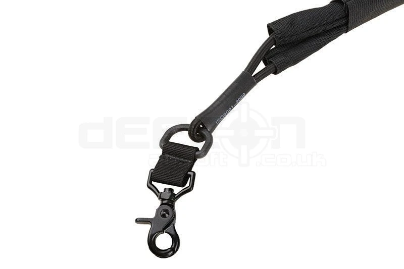 1 point tactical rifle bungee sling designed to limit the effort required to carry your airsoft rifle or to hang on your back or to your side. Single springed clip connects into the front or back sling point of your rifle. Very solid, makes it easier to carry a heavy rifle into battle.