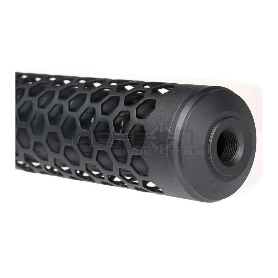 It’s a Mammoth 258mm by 50mm diameter tube with a free-float hex shield surround, beautifully anodized in black or Dark Earth. with a 14mm CCW thread that will fit most airsoft guns.