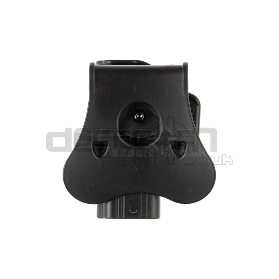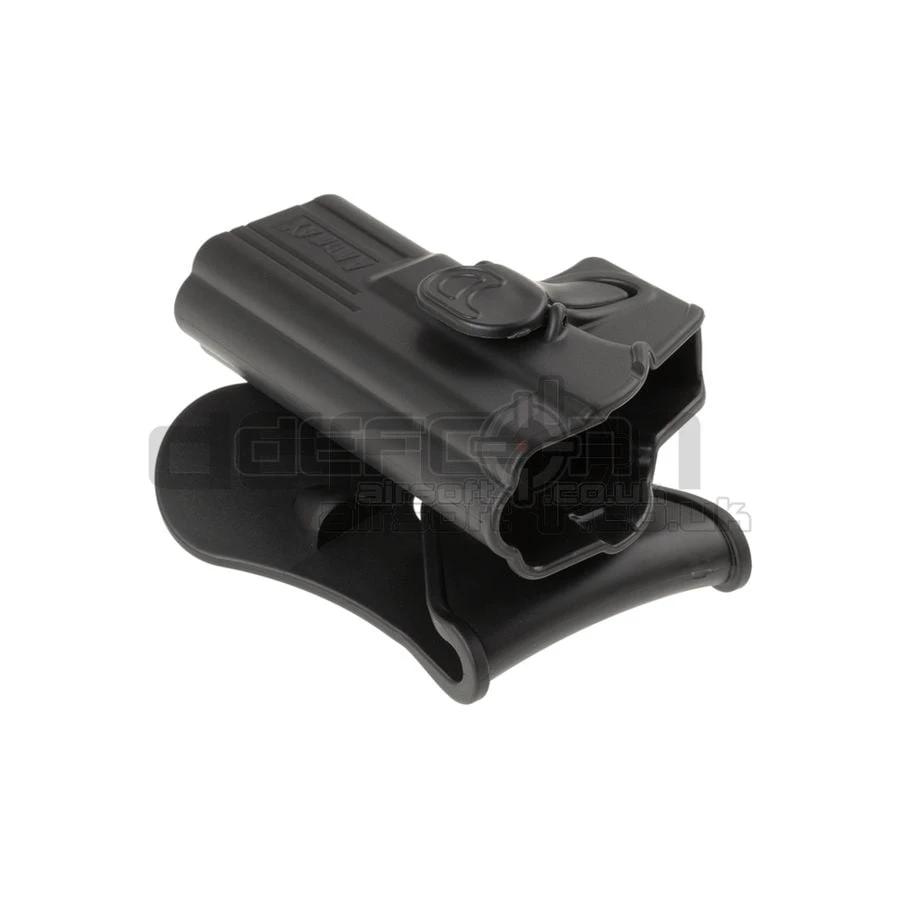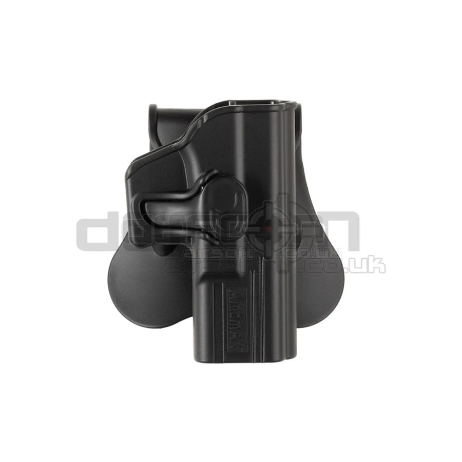 Amomax is a sub-division of Cytac Holsters who produce real steel weapon holster platforms for military and law enforcement agencies worldwide. This is a great SERPA style holster with a rugged design to keep your pistol safe and secure. These holsters lock into the trigger guard of the respective pistol which you can then swiftly release with the sprung paddle on the side. They come with an over-the-waistband paddle attachment as stock but there are other attachments available such as belt clip, MOLLE, and drop leg platform. Paddle and belt clip carry holster on the waistband.