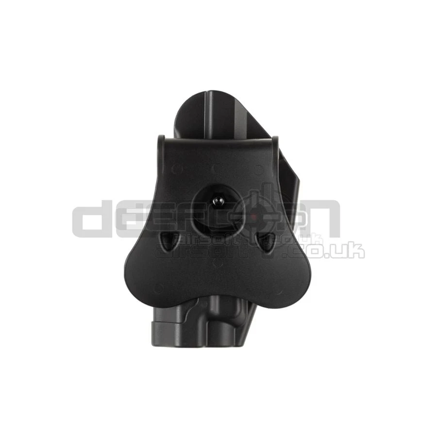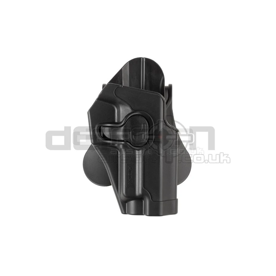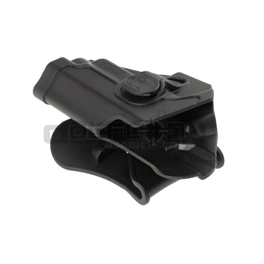 Amomax is a sub-division of Cytac Holsters who produce real steel weapon holster platforms for military and law enforcement agencies worldwide. This is a great SERPA style holster with a rugged design to keep your pistol safe and secure. These holsters lock into the trigger guard of the respective pistol which you can then swiftly release with the sprung paddle on the side. They come with an over-the-waistband paddle attachment as stock but there are other attachments available such as belt clip, MOLLE, and drop leg platform. Paddle and belt clip carry holster on the waistband.