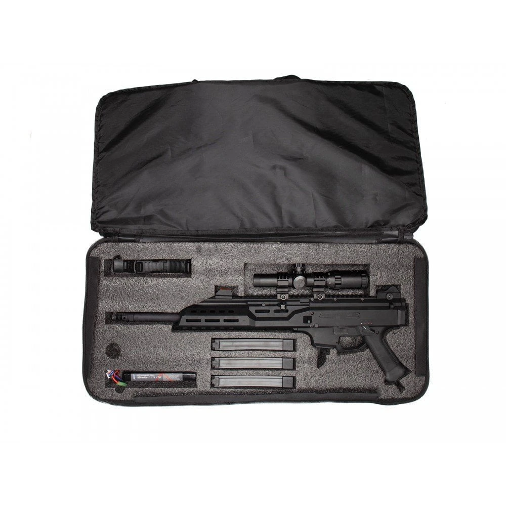 Custom made for the EVO 3 Carbine + B.E.T version, this tactical carry bag is made from Cordura nylon, and features a main compartment with cut-out foam. The foam keeps the EVO tightly in place with extra space for any type of optical sights the user might wish to mount to the gun. The exterior of the bag features 3 mag pockets for a total of 9 magazines, a long pocket that can hold a large BB bottle and 2x zippered admin pocket with Velcro attachment area. The EVO 3 A1 logo is shown in stylish 3 color embroidery.
