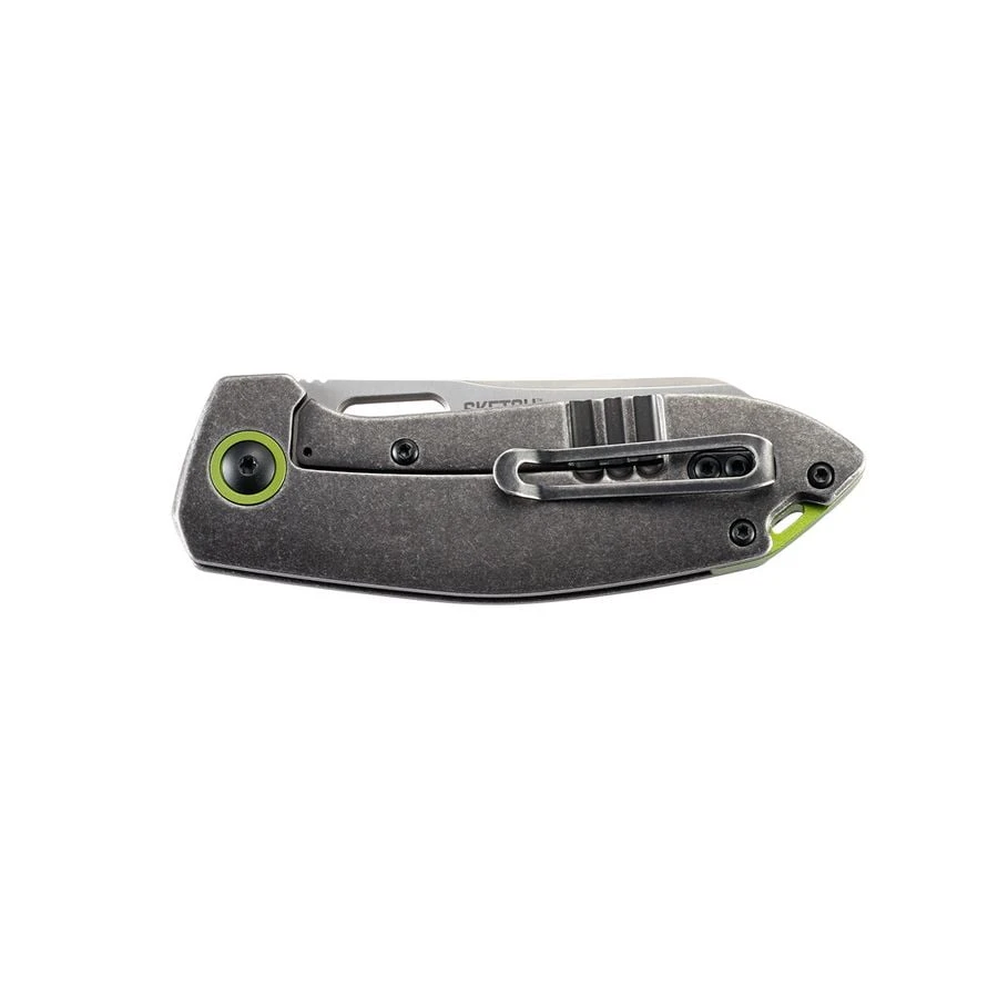 The Sketch is offered to you with a strong blade made of carbon stainless steel that has a satin finish. With a light green anodized backspacer and pivot ring, the stainless steel handle stands out.