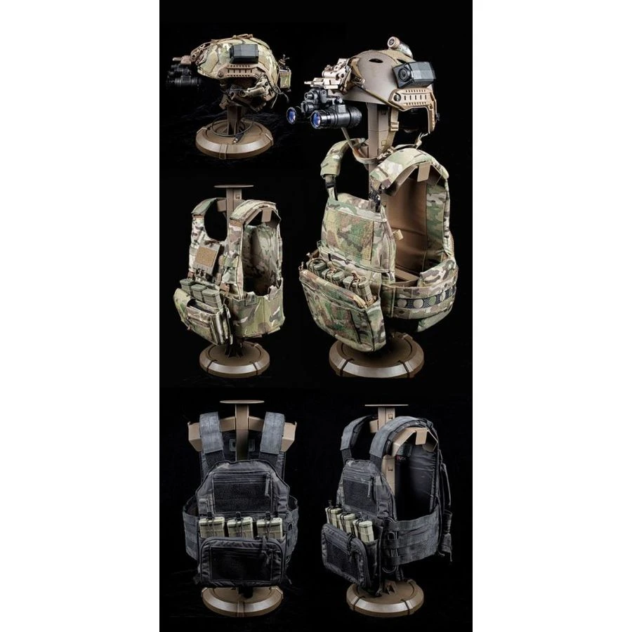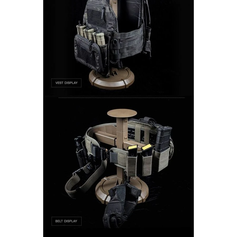 The Equipment Display Stand for Vests, Belts, and Helmets in Tan by Bigfoot offers an effective solution for showcasing tactical gear. The stand facilitates quick assembly and disassembly, making it ideal for various display needs. Its design allows for both full and modular use, providing flexibility for different environments.