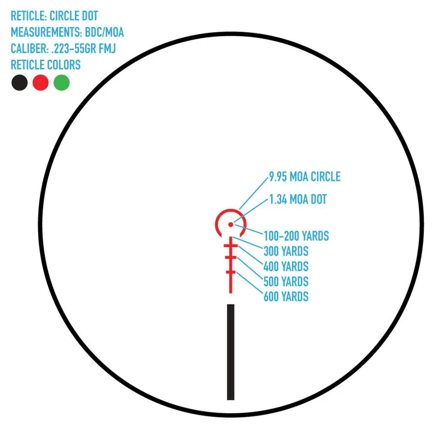 Housed in a durable aluminium body, the RapidStrike 1-6x is IP67 waterproof and dustproof, fog-proof, able to withstand up to .338 calibre recoil and capable of operating in temperatures ranging from -13F to 131F. Utilizing CR2032 batteries, the RapidStrike will function up to 100 hours and weighs a mere 13.8 ounces.