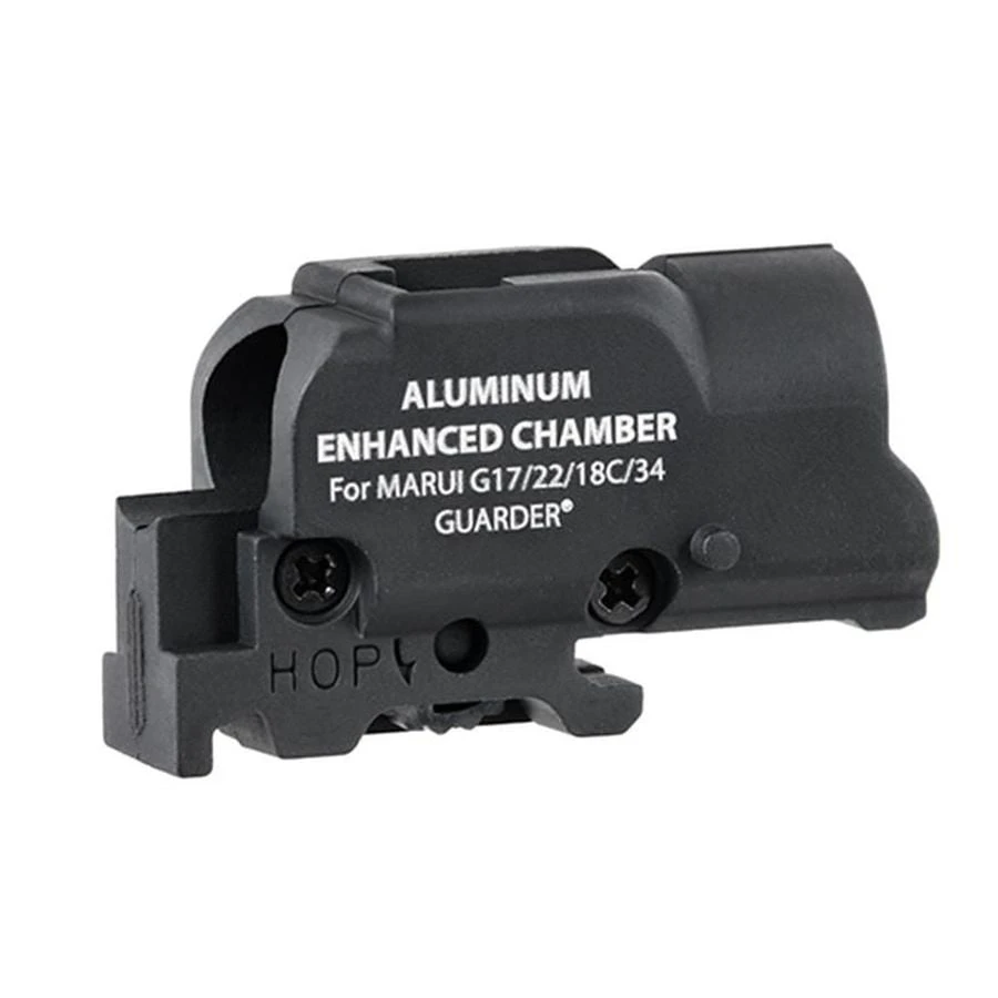 The Guarder Enhanced Hop-Up Chamber Set is designed specifically for Tokyo Marui G26 and KJWorks G19/23 models. This product features a robust construction made from aluminium and steel, ensuring durability and reliability in various conditions.