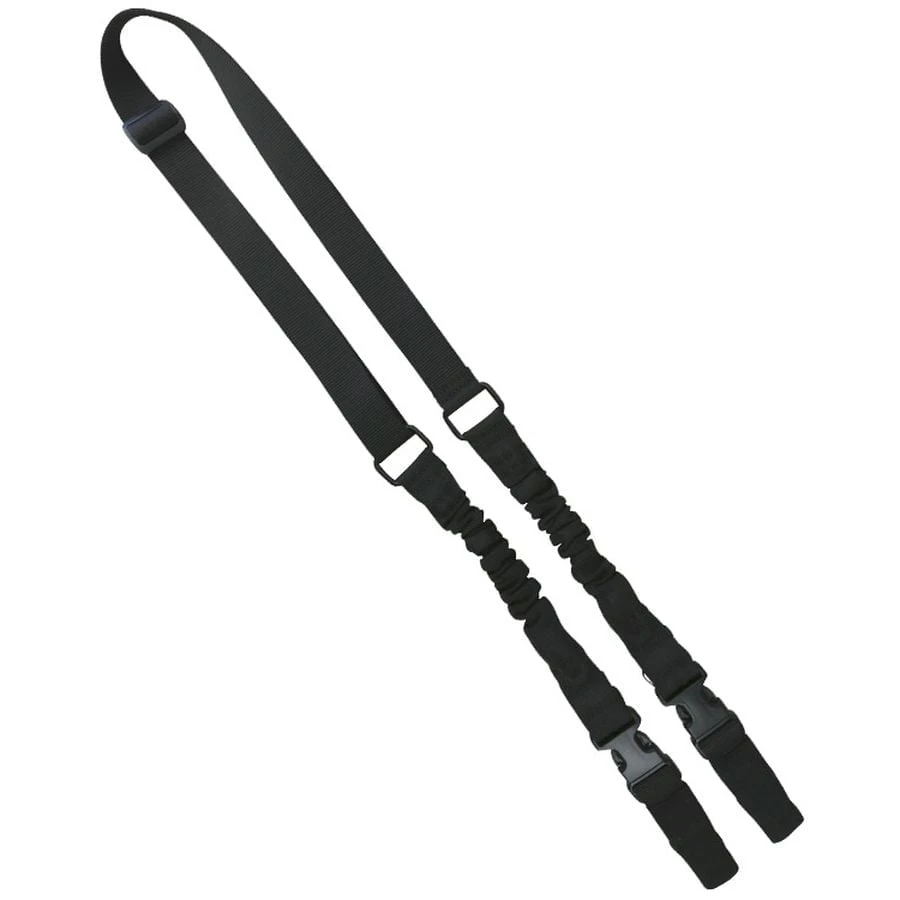 The KombatUK Double Point Bungee Sling in black offers a durable and flexible solution for carrying your equipment. This product features 30mm heavy duty nylon for added strength and longevity. It incorporates two sleeved internal bungees, providing 14cm of flex for added comfort during use.