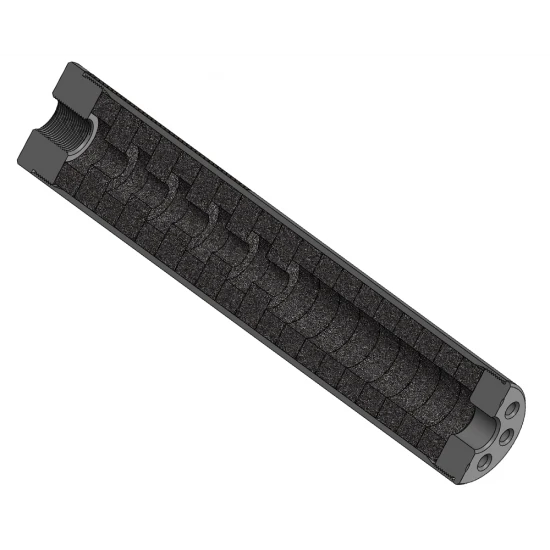 The first half of the silencer is filled with foam discs of two different diameters for maximum efficiency. The cavities will catch any surplus air that escapes from the inner barrel.