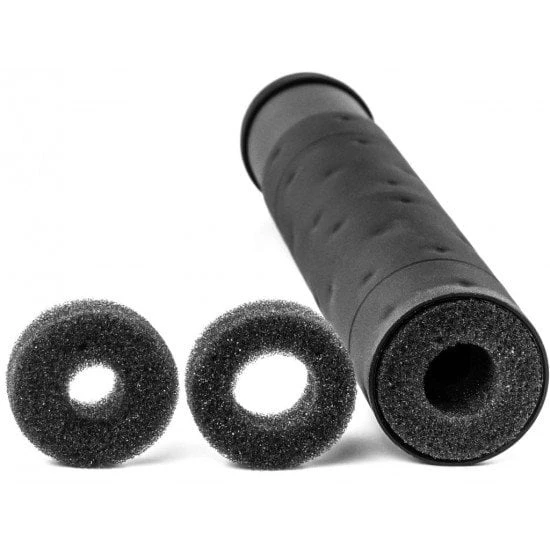 The foam discs within mimic the real-steel suppressor’s baffled mechanisms.