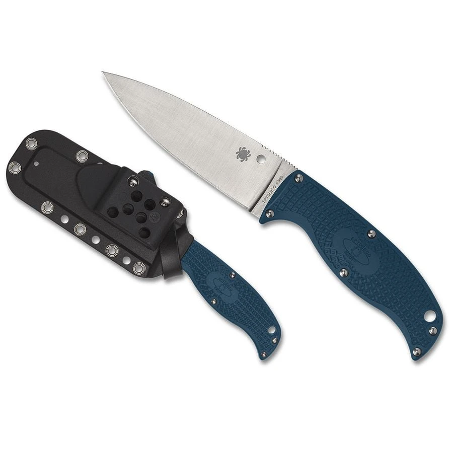 These characteristics are fully tapped by the Enuff 2’s full-flat-ground PlainEdge blade, which results in exceptional cutting performance. Its whole tang is skeletonized, and its strong, blue-injection-molded FRN scales are a signature feature of Spyderco’s K390 line of knives. This Enuff 2 incorporates an injection-molded polymer sheath with snap-fit retention and a supplementary leather retaining strap for convenience in carrying and quick access.