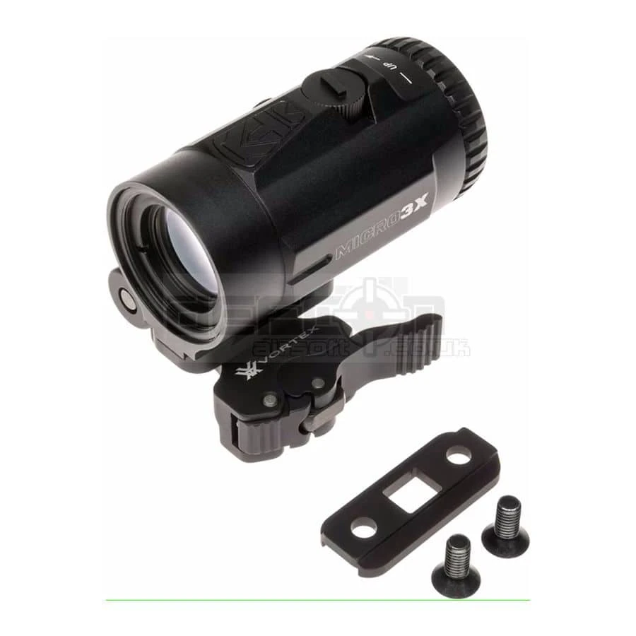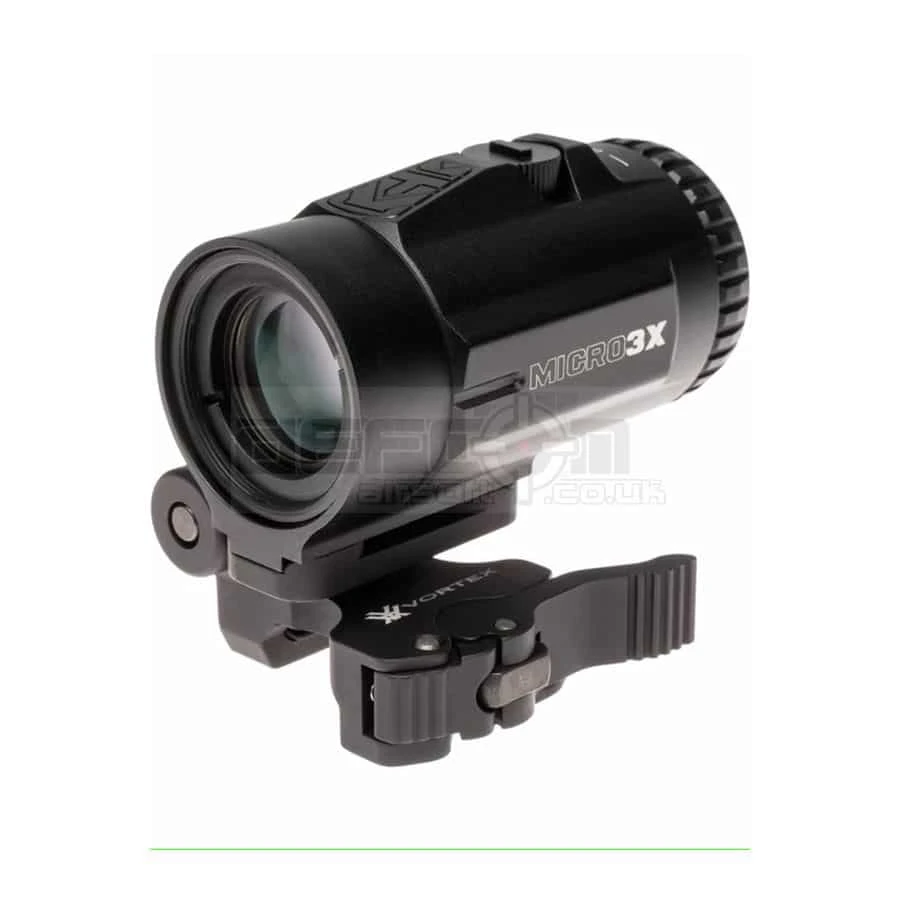 Next level 3X magnification versatility when you need it for your red dot or holographic sight in an ultracompact, lightweight, and optically crisp package. Integrated quick-release allows fast attach/detach while camlock engages/disengages magnifier with direct pressure. Adjustable flip mount allows for right or left-handed use.